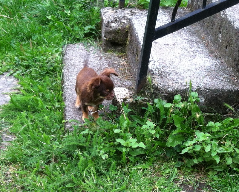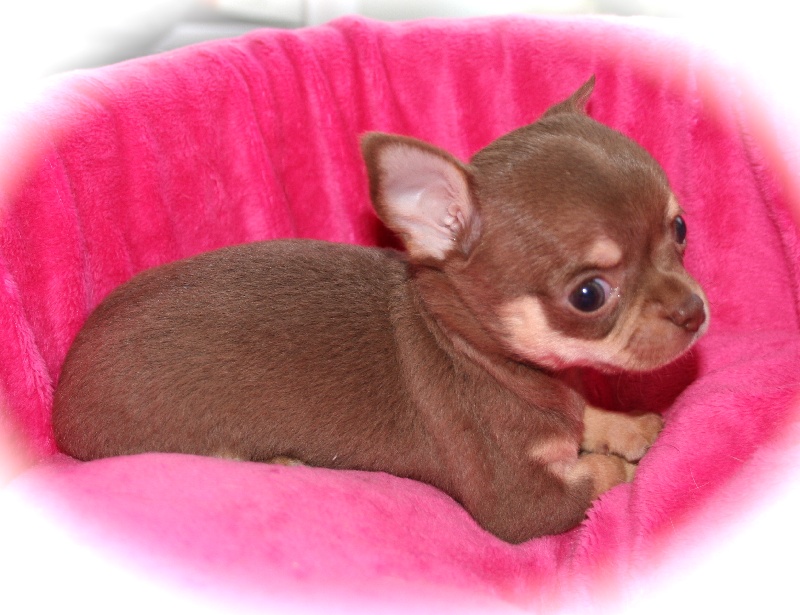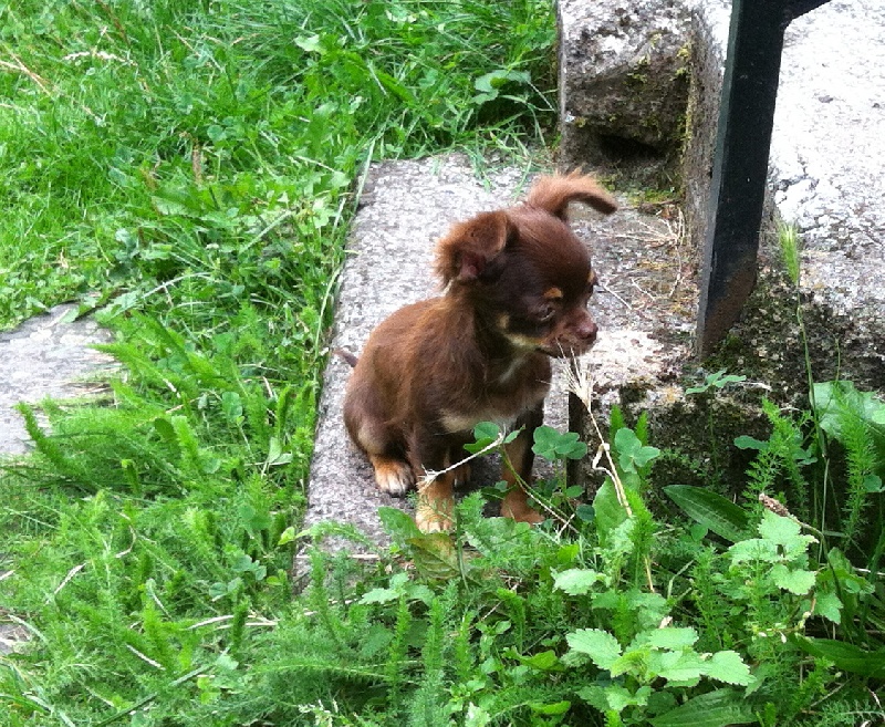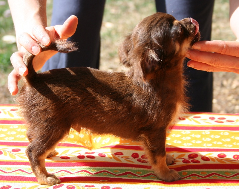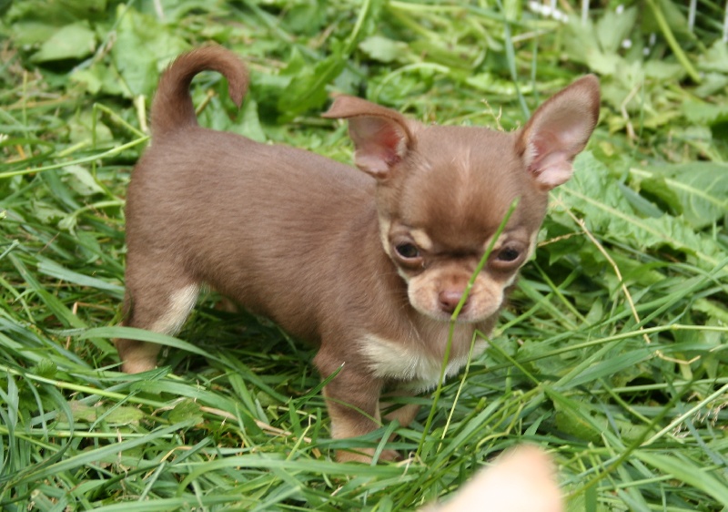 Mâle de couleur chocolat, plastron blanc. Très typé (tête bien ronde, stop très marqué et nez bien court). Petit gabarit actuellement estimé à environ 1,8kg-2kg adulte (ceci n'est qu'une idée approximative, en aucun cas une certitude).